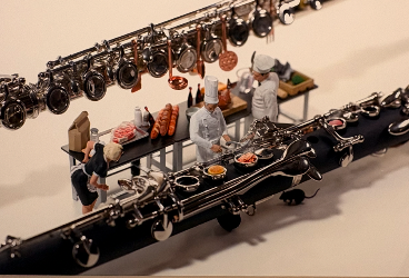 「楽器で奏でる食のハーモニー」は、クラリネットをキッチン台に見立て、シェフが料理を“演奏のように奏でている”様子を表した作品です。
