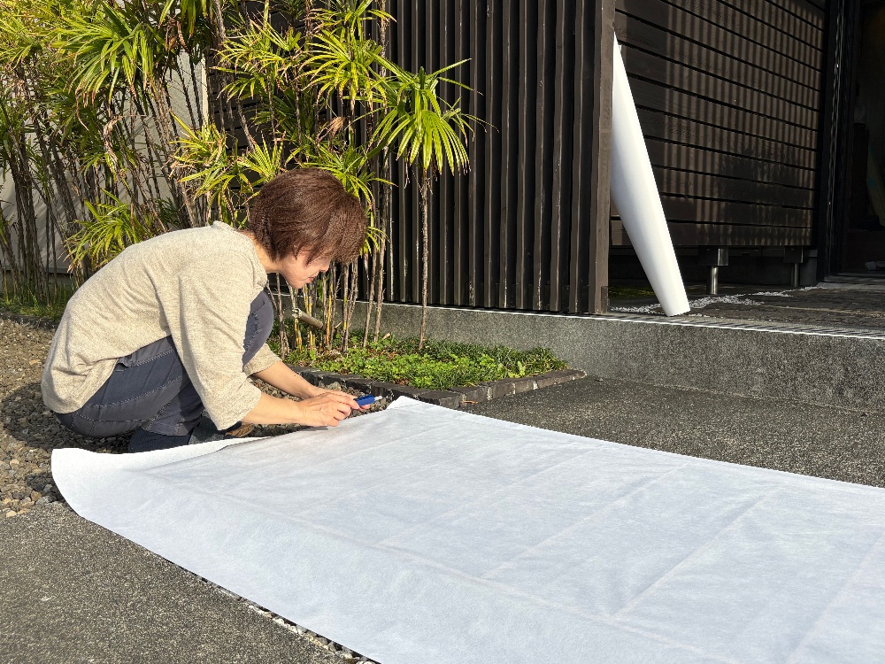 上から順に、反対側へ軽く引っ張りながら、中心から外側へ空気が入らないように貼っていきます。
