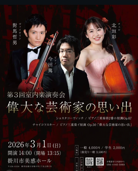 今田篤さん、對馬哲男さん、北垣彩さんによるピアノ三重奏(ピアノ・ヴァイオリン・チェロ)を聴きに行ってきました。