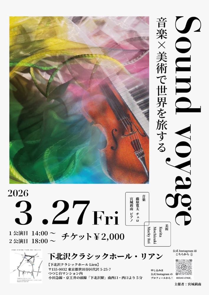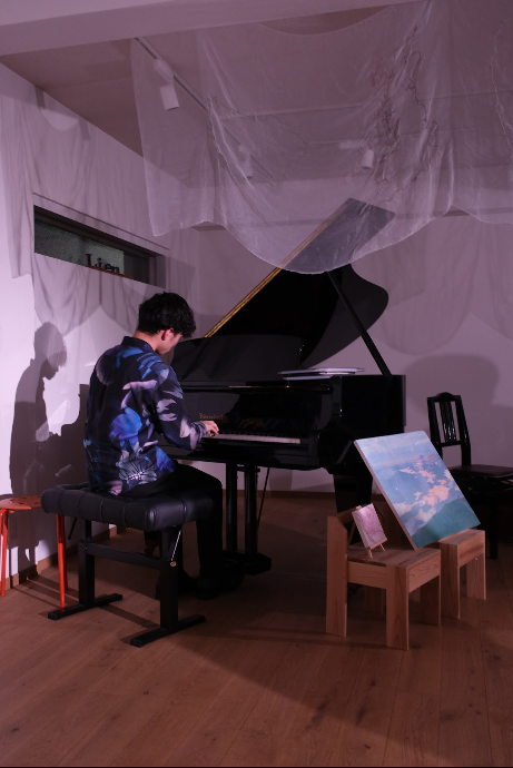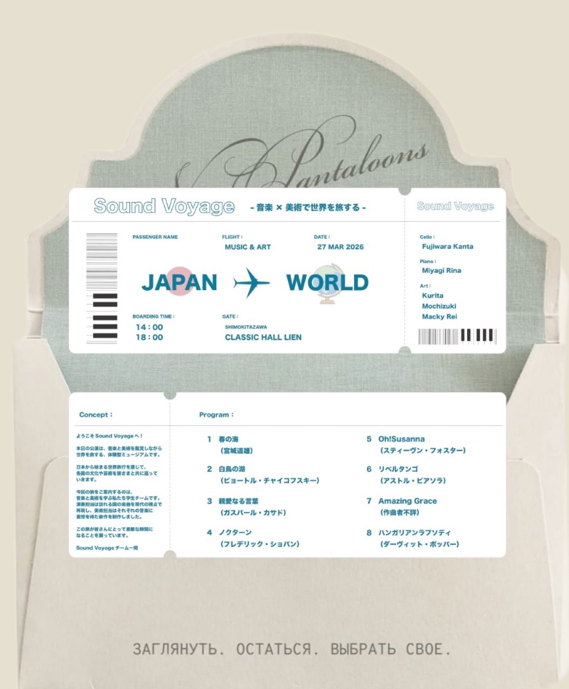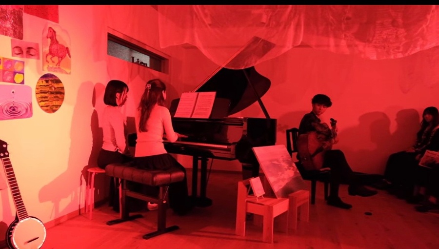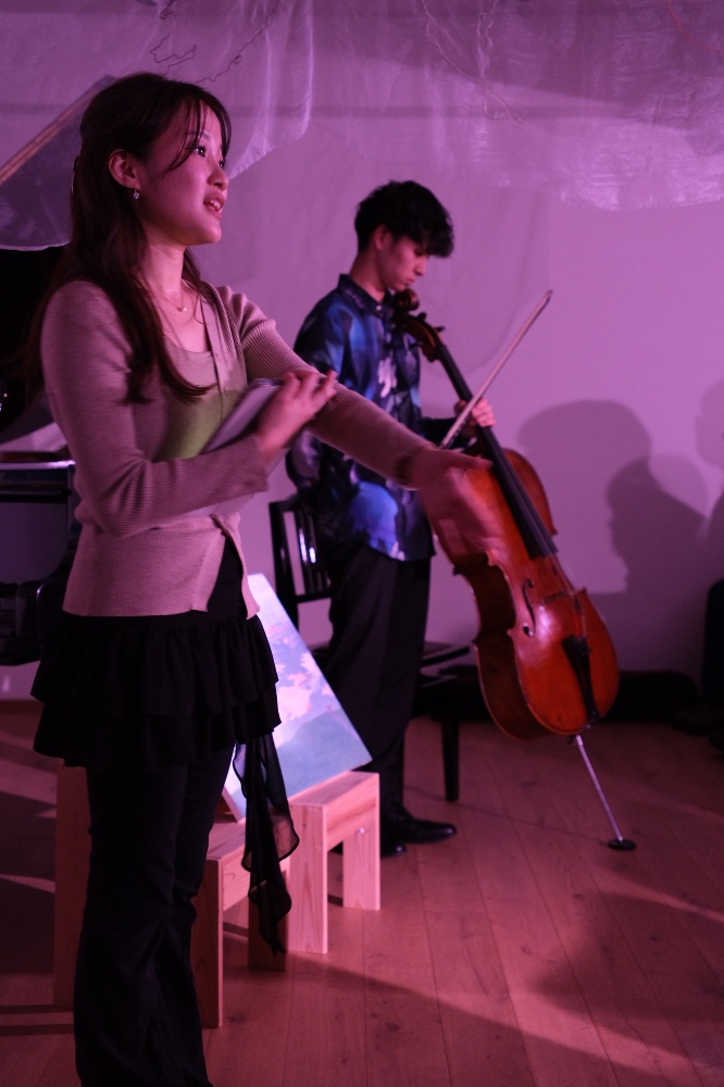 当日は100名近い満席のお客様にお越しいただき、音楽と美術、照明が一体となった空間の中で、会場全体が「旅」をしているような時間が流れていました。